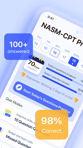 NASM CPT Exam Prep 2023 is an exam preparation app that will support you pass the Certified Personal Trainer (CPT) exam administered by the National Academy of Sports Medicine (NASM) with a high score on your 1st attempt.
